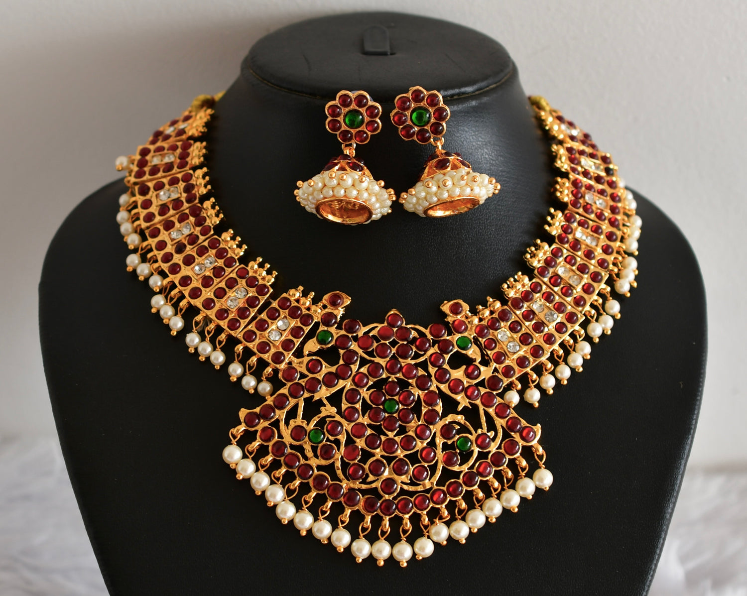 Gold Tone kerala style red palakka Lakshmi Necklace Set Dj-52204