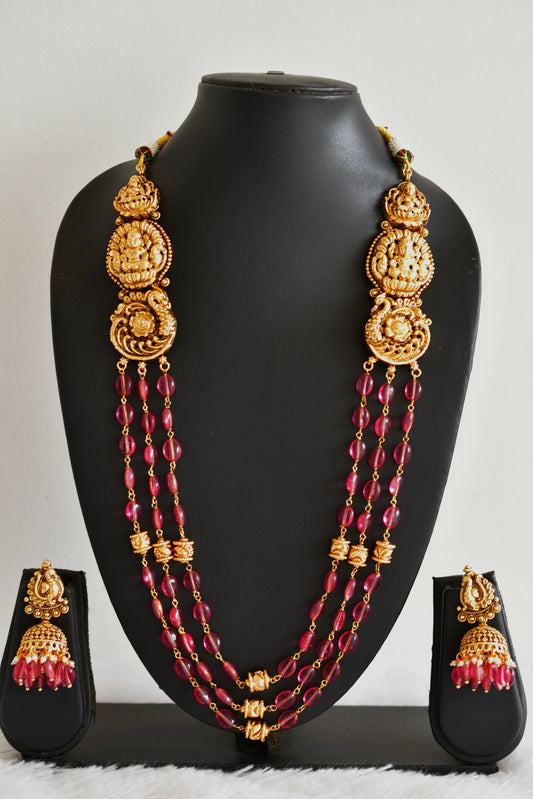 Antique gold tone magenta pink beaded lakshmi peacock multi layer haar set dj-52427