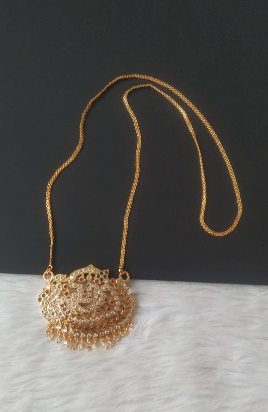 Gold tone chain with AD pink-green Om peacock pendant dj-52180