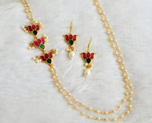 Gold tone pink green kundan jadau lotus pearl mugappu chain set dj-49912
