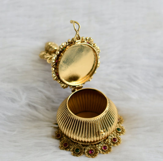 Antique gold tone kemp-green radha-krishna flower kumkum box dj-47362