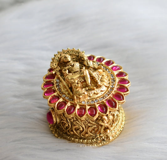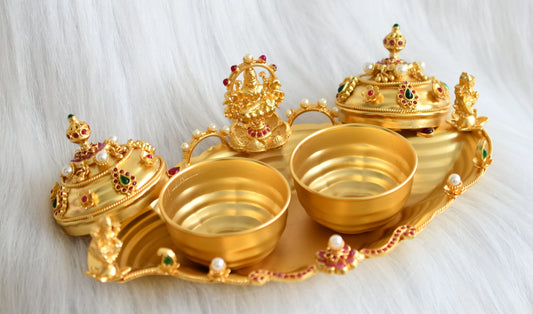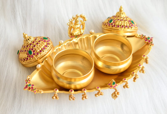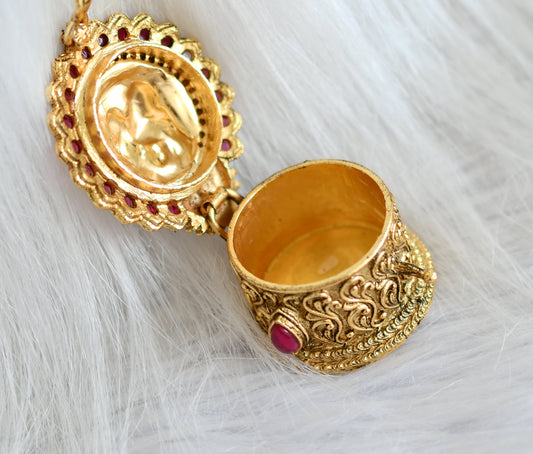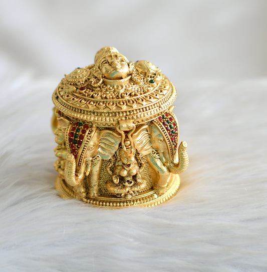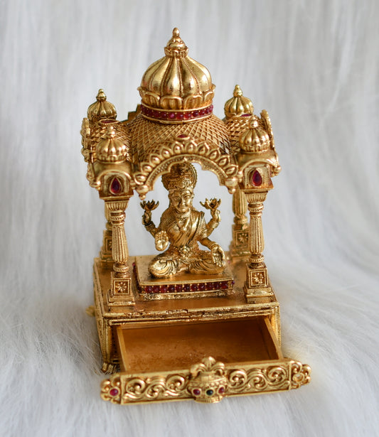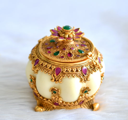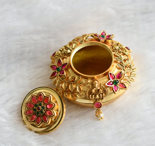 Matte gold tone ruby-emerald pearl lakshmi flower kumkum box dj-44252