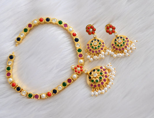Gold tone navarathna south Indian style attigai/necklace set dj-18305