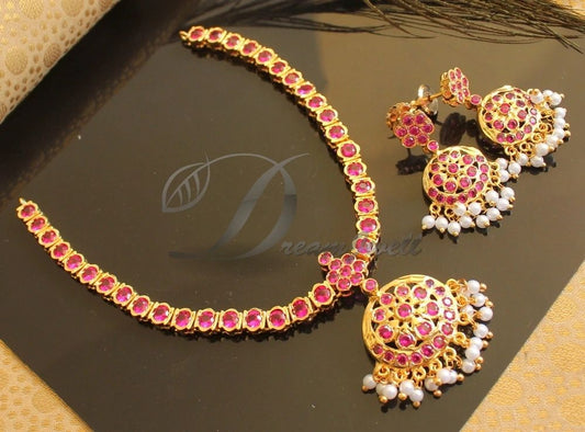 Gold Tone AD Pink South Indian Style Attigai/Necklace Set DJ18307