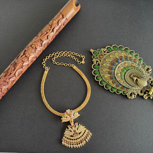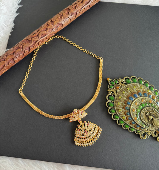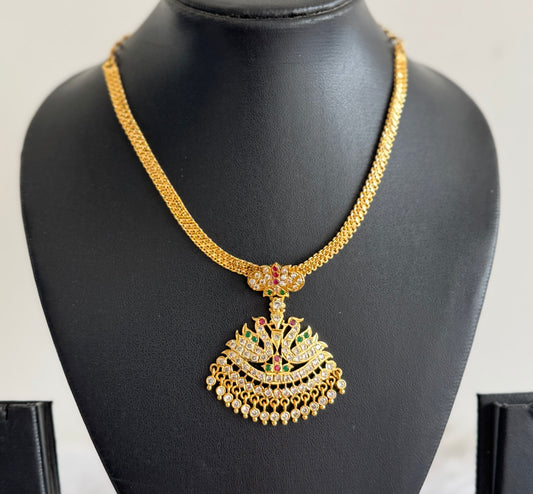 Gold tone south indian AD pink-green-white peacock attigai/necklace dj-51894
