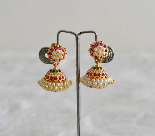 Gold tone South Indian style pink-green-white pearl jhumkka dj-51887