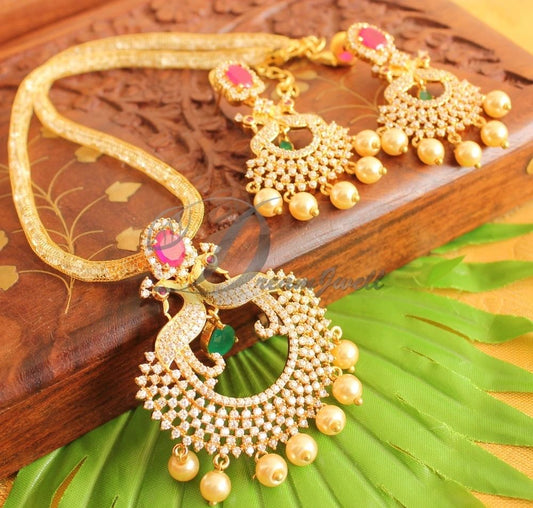Matte Finish Ruby Pearl Peacock Necklace Set-dj11194