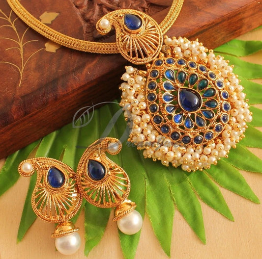 Antique Gold Tone Blue Pearl Cluster Mango Necklace Set DJ11286
