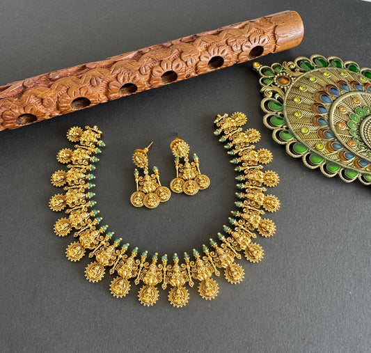 Antique gold tone lakshmi green beaded necklace set dj-52076