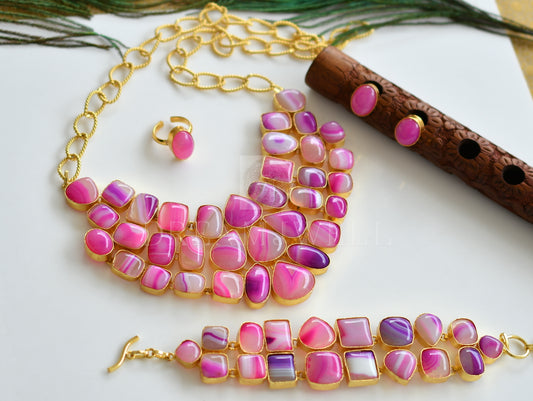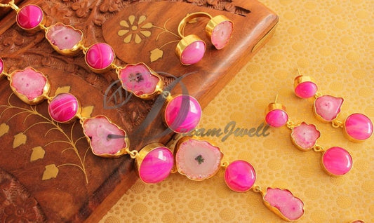 Gold tone Druzzy stone Pink Necklace combo Set-dj12542