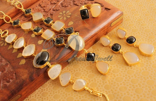 Gold tone Druzzy stone Black-Cream Necklace combo Set dj12543