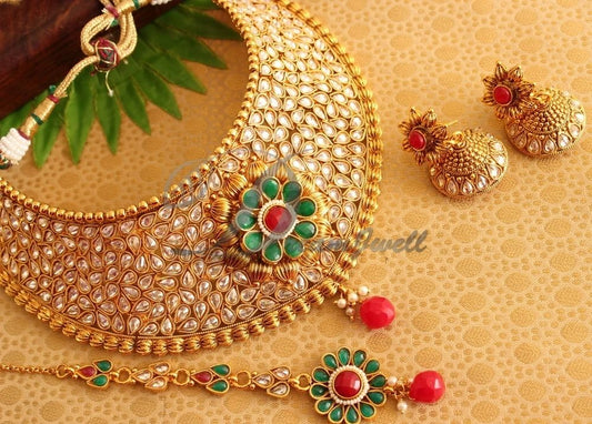 Antique gold tone Polki Ruby-green Choker Set DJ12643
