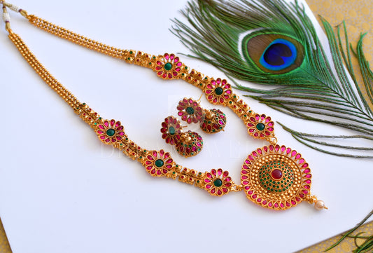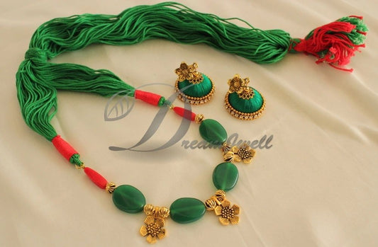 Antique Red-Green Flower threaded Necklace Set -dj09749
