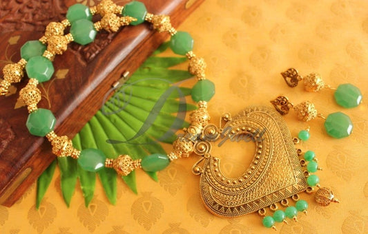 Antique gold tone Faceted Coin Green Bead Necklace Set -dj11163