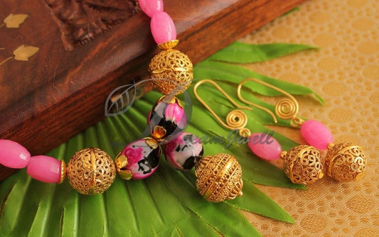Antique Gold Tone Pink Agate Beaded Necklace Set-dj11198