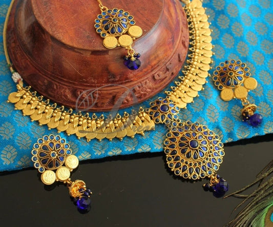 Antique gold tone Blue Peacock Coin Necklace Set-dj04158