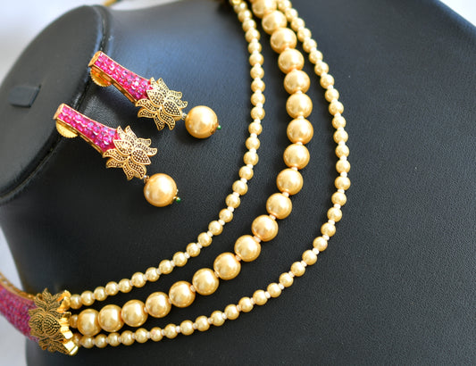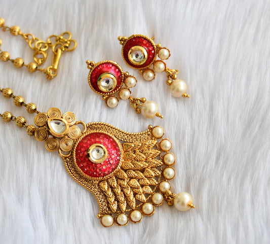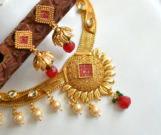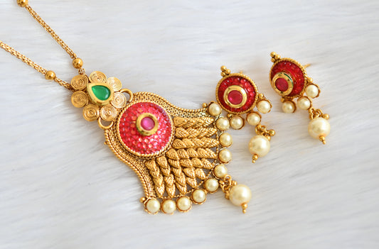 Antique Gold tone semiprecious ruby-pearl bridal Lotus necklace set dj-02544