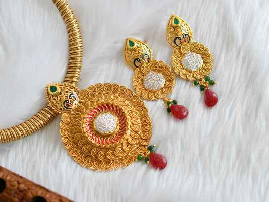 Antique Gold tone Semiprecious Ruby-emerald-pearl bridal lotus necklace set dj-02545