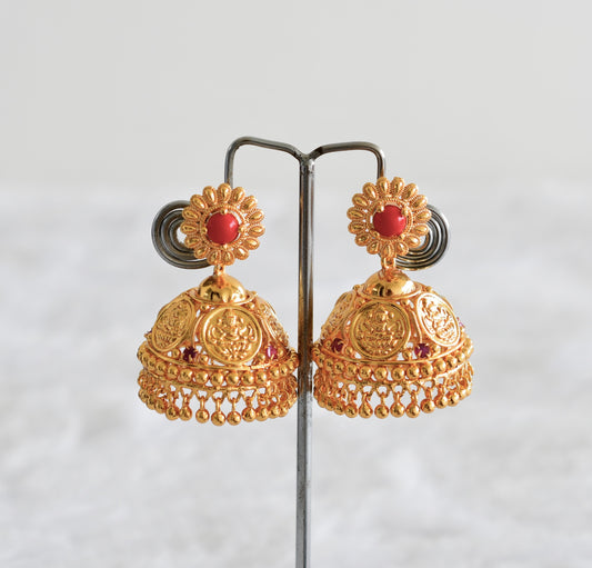 Gold tone coral-ruby lakshmi coin jhumkka dj-51885