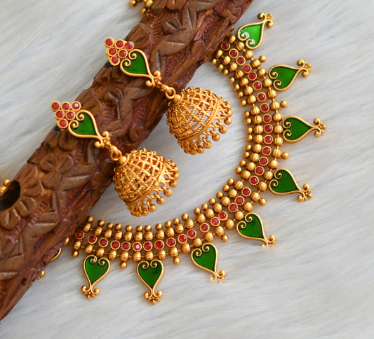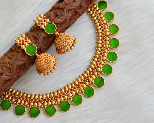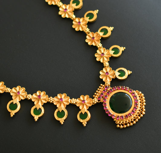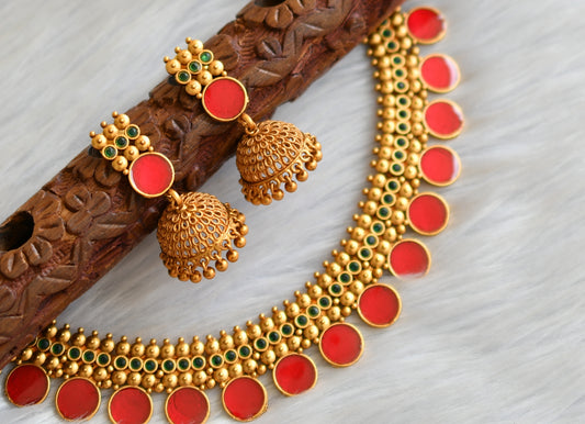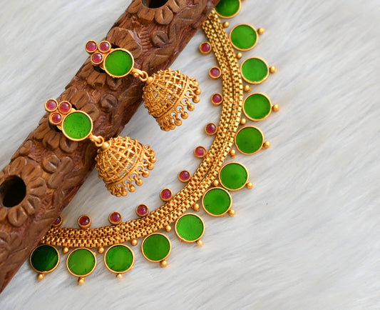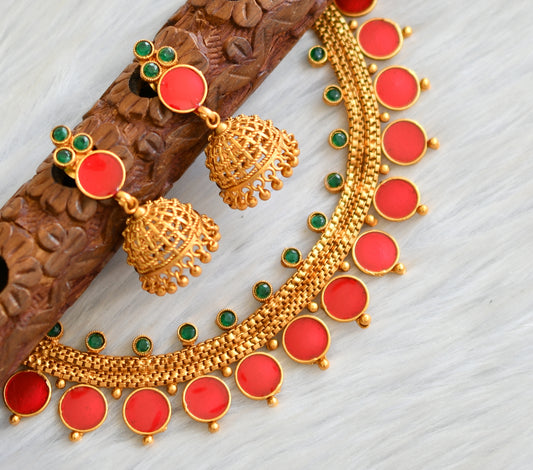 Matte finish green-red round Kerala style necklace set dj-41595