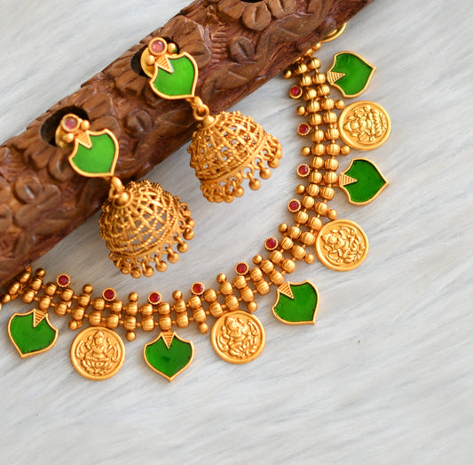 Matte finish red-green palakka Lakshmi coin Kerala style necklace set dj-41609