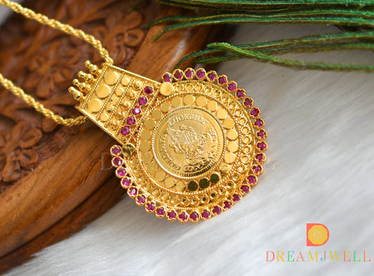 Gold tone pink stone Kerala style Lakshmi pendant with chain dj-37772