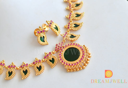 Gold tone AD pink stone green mango Kerala style necklace set dj-36392