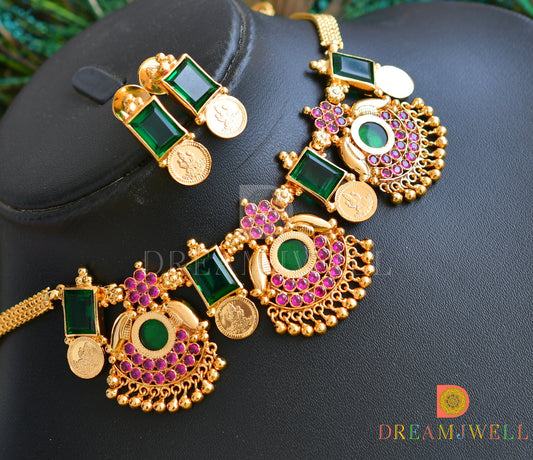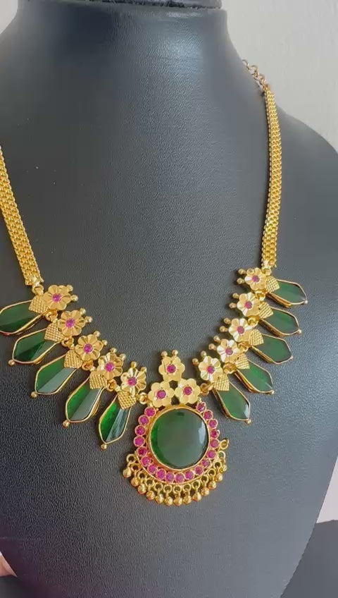 Gold tone AD pink stone green round Kerala style necklace dj-36399
