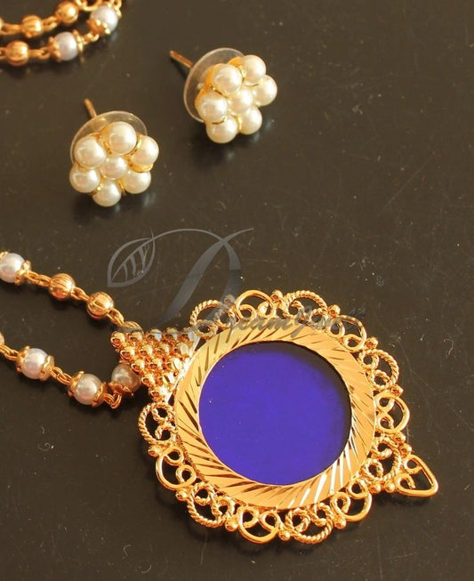 Gold Tone Kerala Style Pearl Blue Round Necklace Set DJ24605