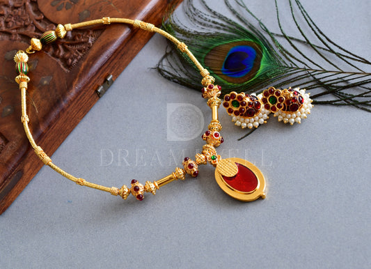 Gold Tone Ruby-emerald kerala style Necklace With Screw Back Earrings -dj08602