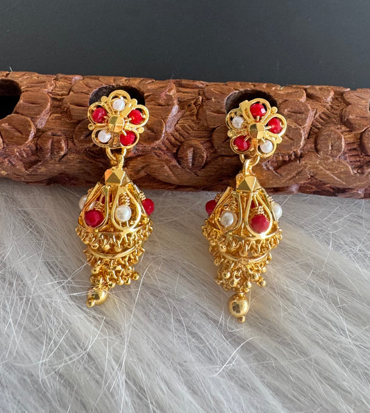Gold tone coral-pearl beaded step jhumkka dj-51280