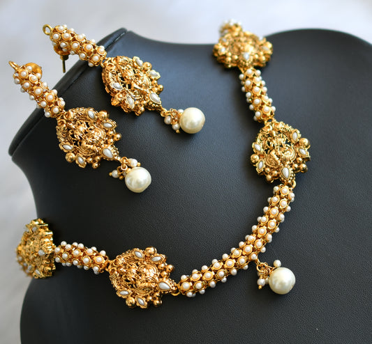 Antique gold tone Pearl Lakshmi Mugappu Necklace Set-dj03098