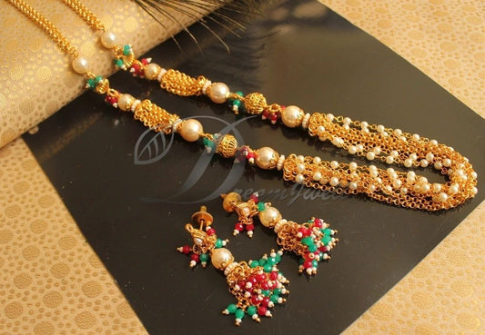 Gold tone Red-green Pearl Mala Necklace Set DJ18393