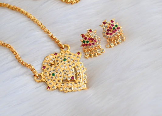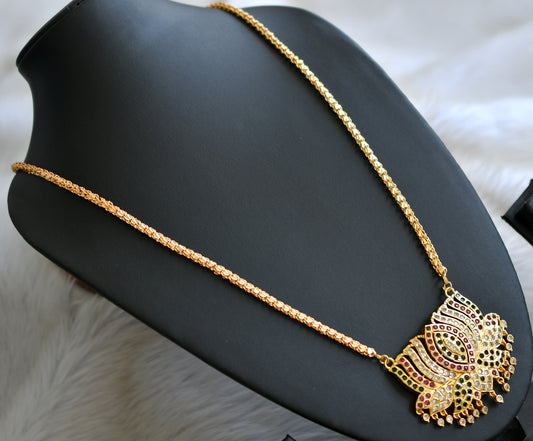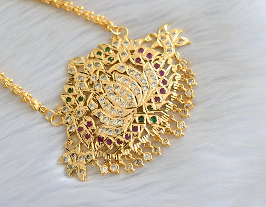 Gold tone white-ruby-green stone Lotus South Indian pendant with chain dj-40907