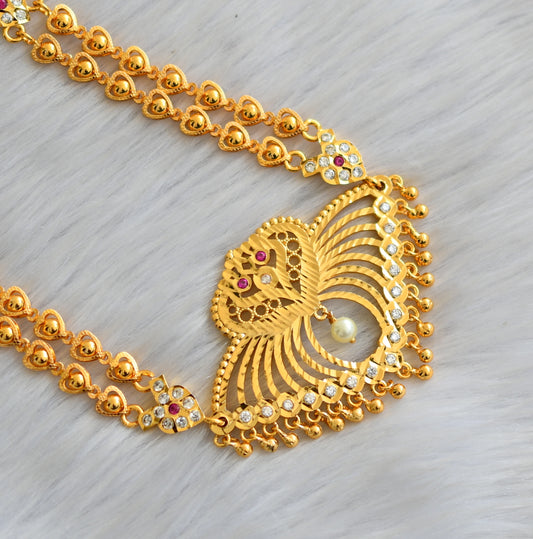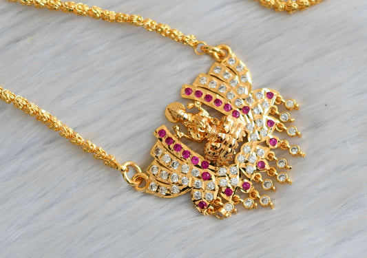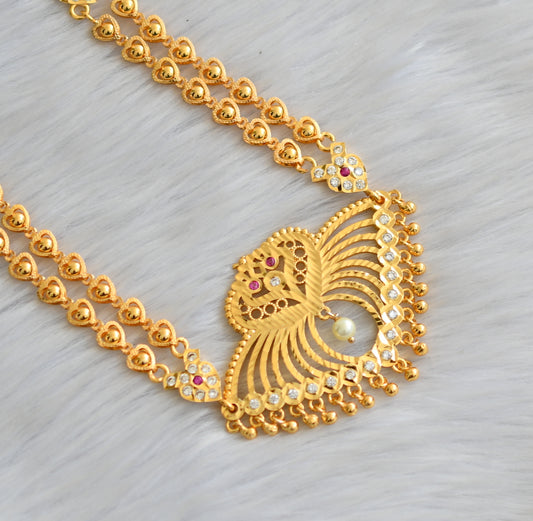 Gold tone ruby-white stone peacock pendant south Indian style short haar dj-41655