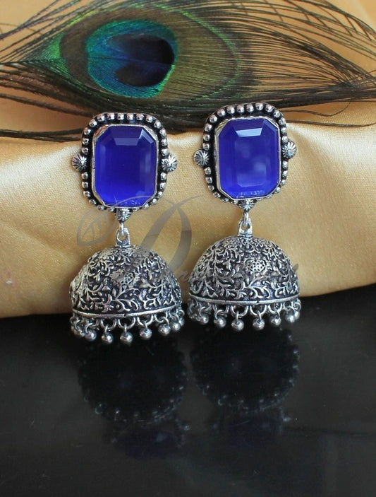 Silver tone Royal Blue block stone Jhumkka DJ22680