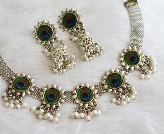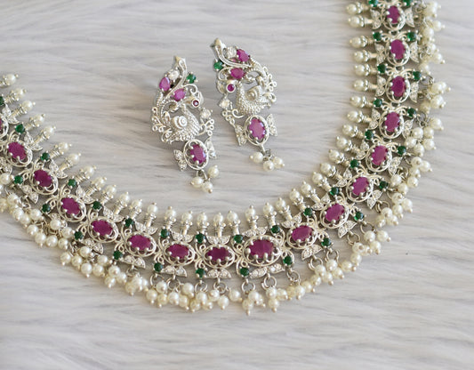 Silver tone ruby-green-white pearl peacock gutta pusalu necklace set dj-45411