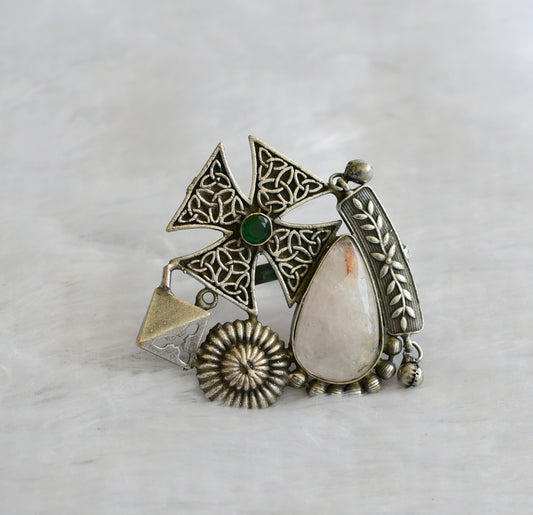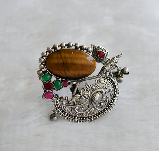 Silver tone brown stone big bracelet with adjustable finger ring dj-46427