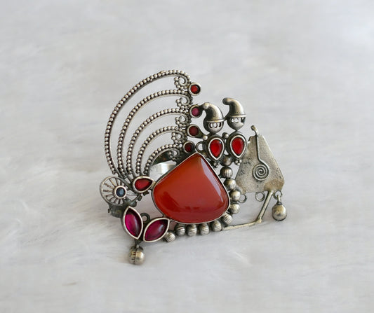 Silver tone red stone big bracelet with adjustable finger ring dj-46430