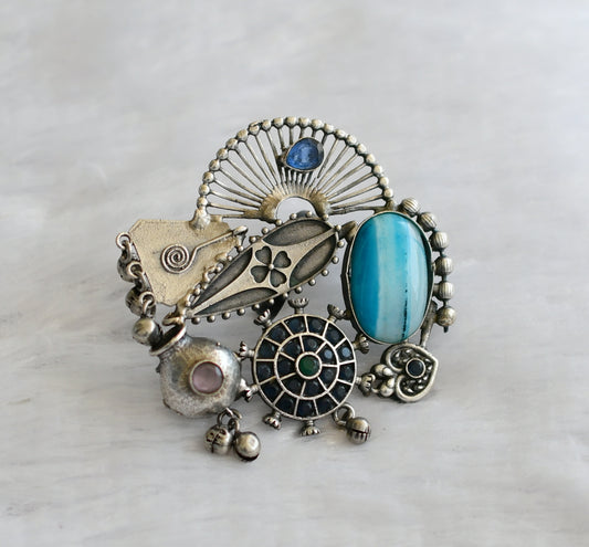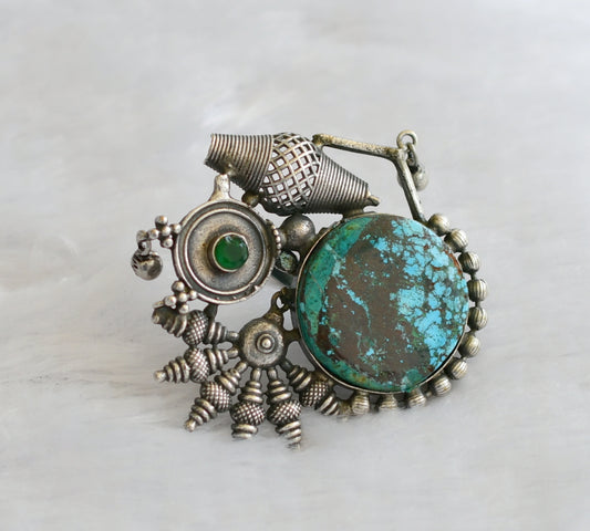 Silver tone turquoise blue stone big bracelet with adjustable finger ring dj-46431