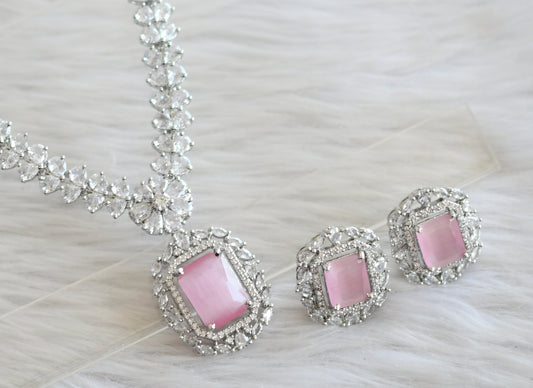 Silver tone baby pink-white square stone necklace set dj-44834