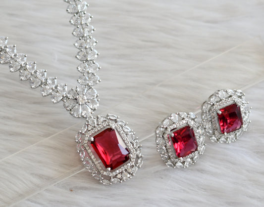 Silver tone magenta pink-white square stone necklaace set dj-44835