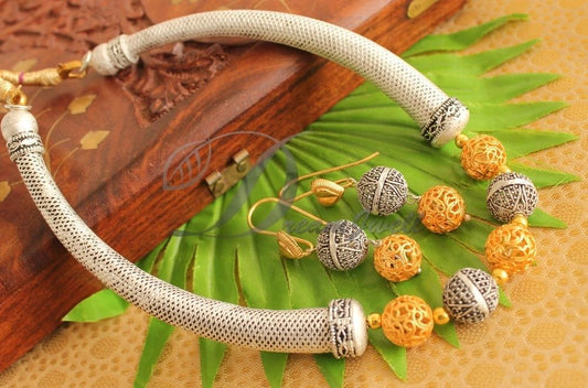 Beautiful Dual Tone Oxidised Silver Designer Balls Kante Necklace Set-dj07153