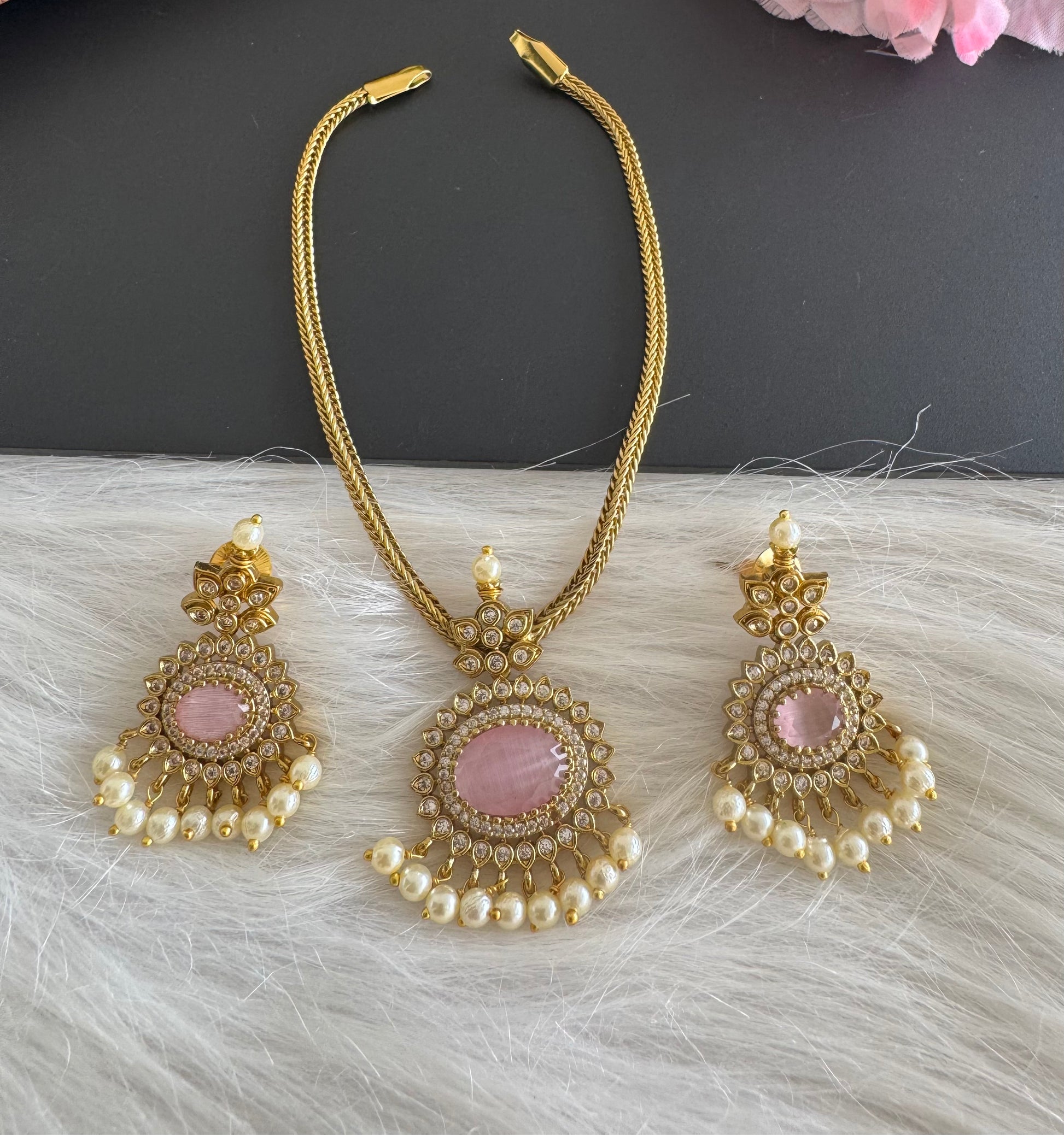Antique gold tone cz baby pink oval stone necklace set dj-51204