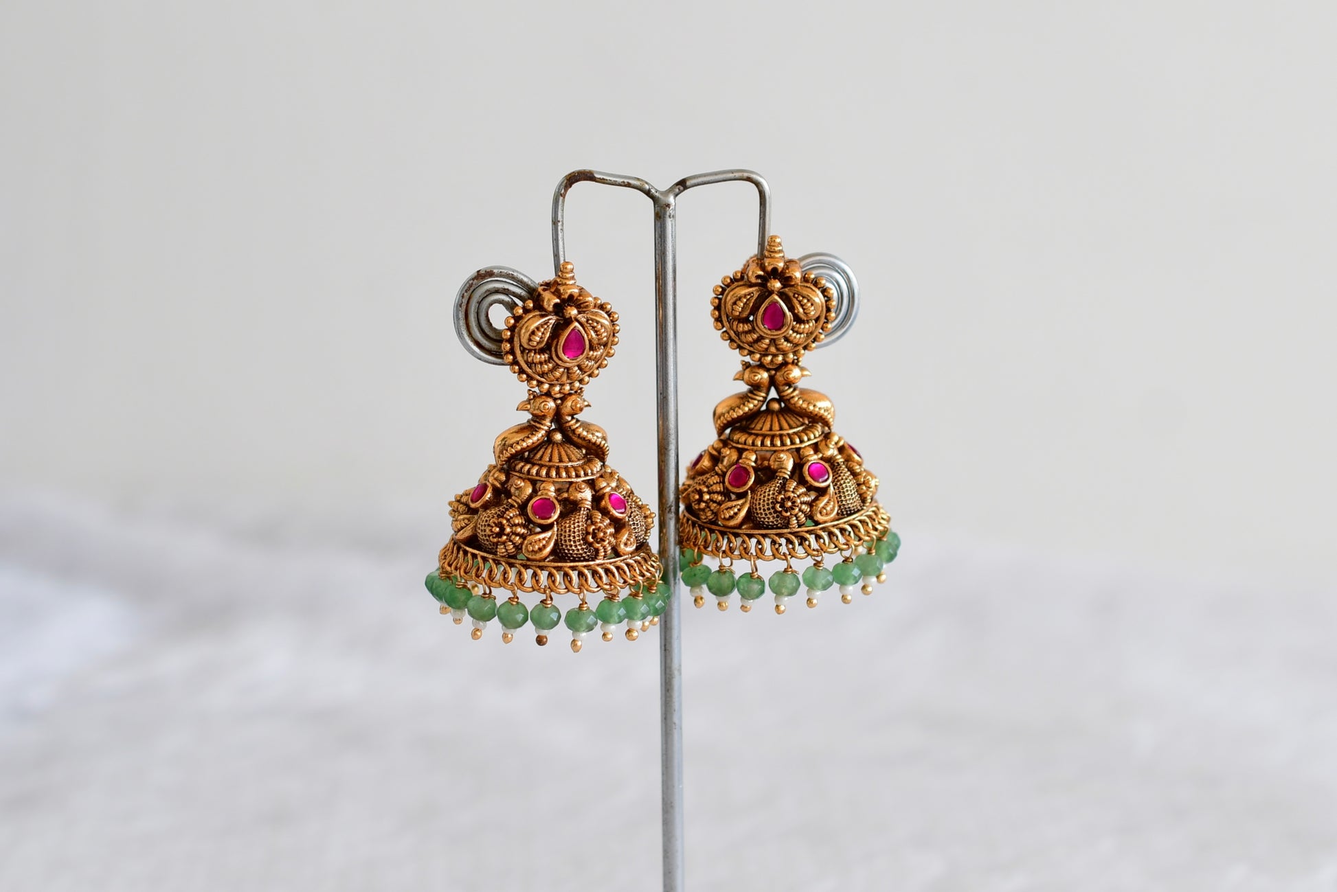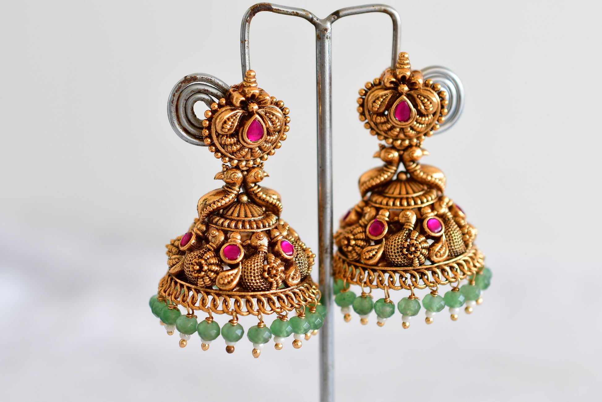 Antique gold tone pink green beaded swan jhumkka dj-52504
