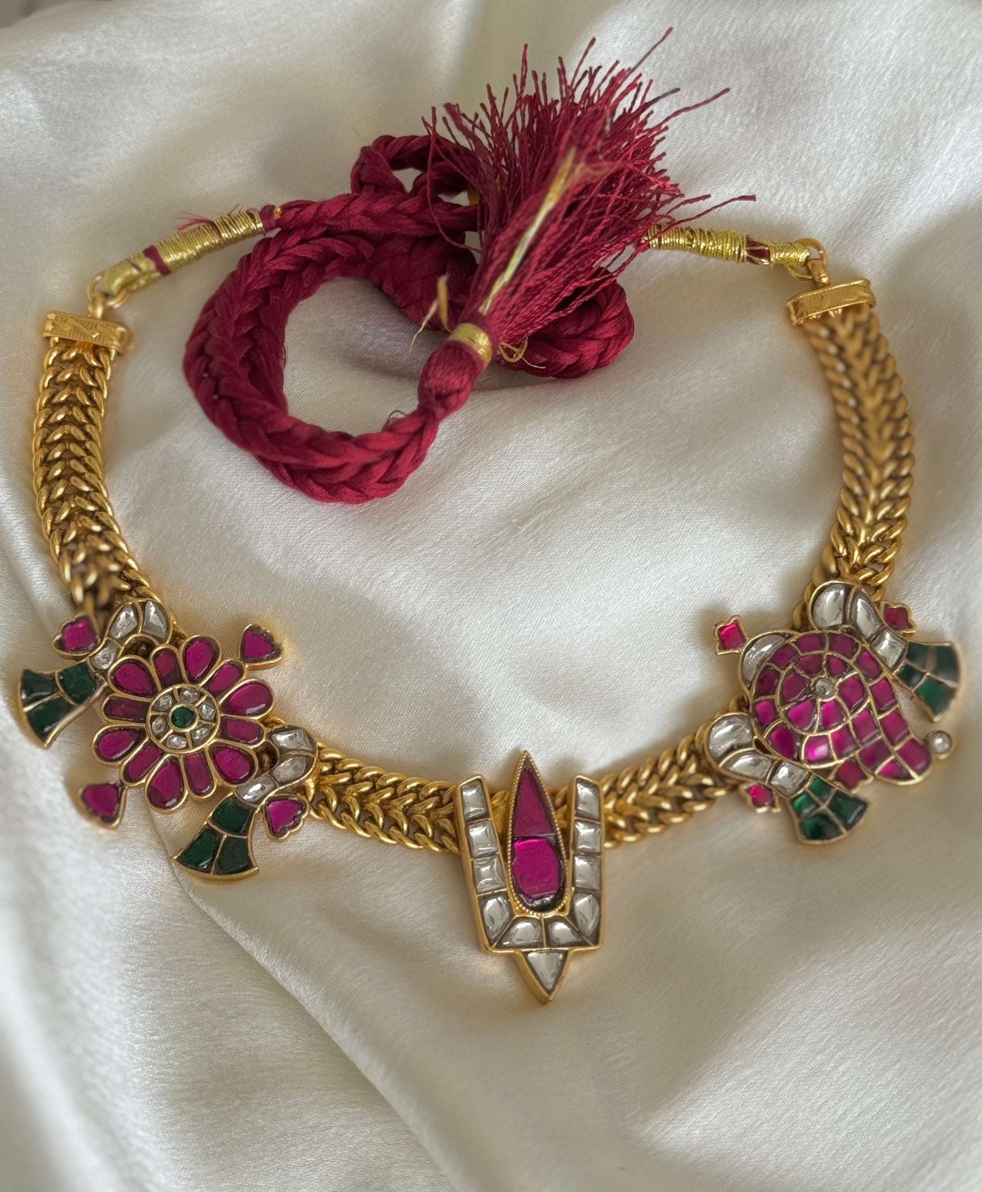 Antique gold tone jadau Shri Thirumal nama-shanku-chakra necklace dj-51549