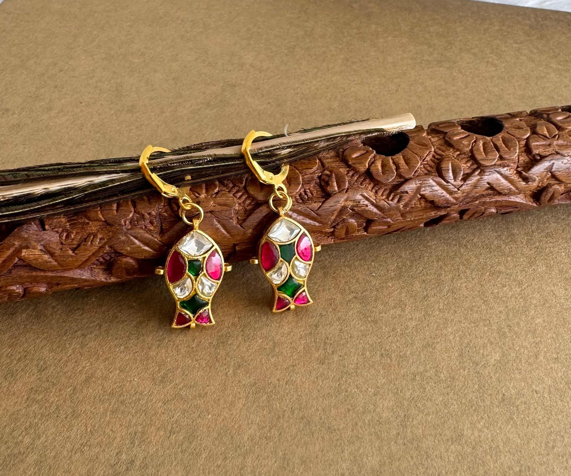 Gold tone pink-green-white kundan jadau fish hook earrings dj-51531