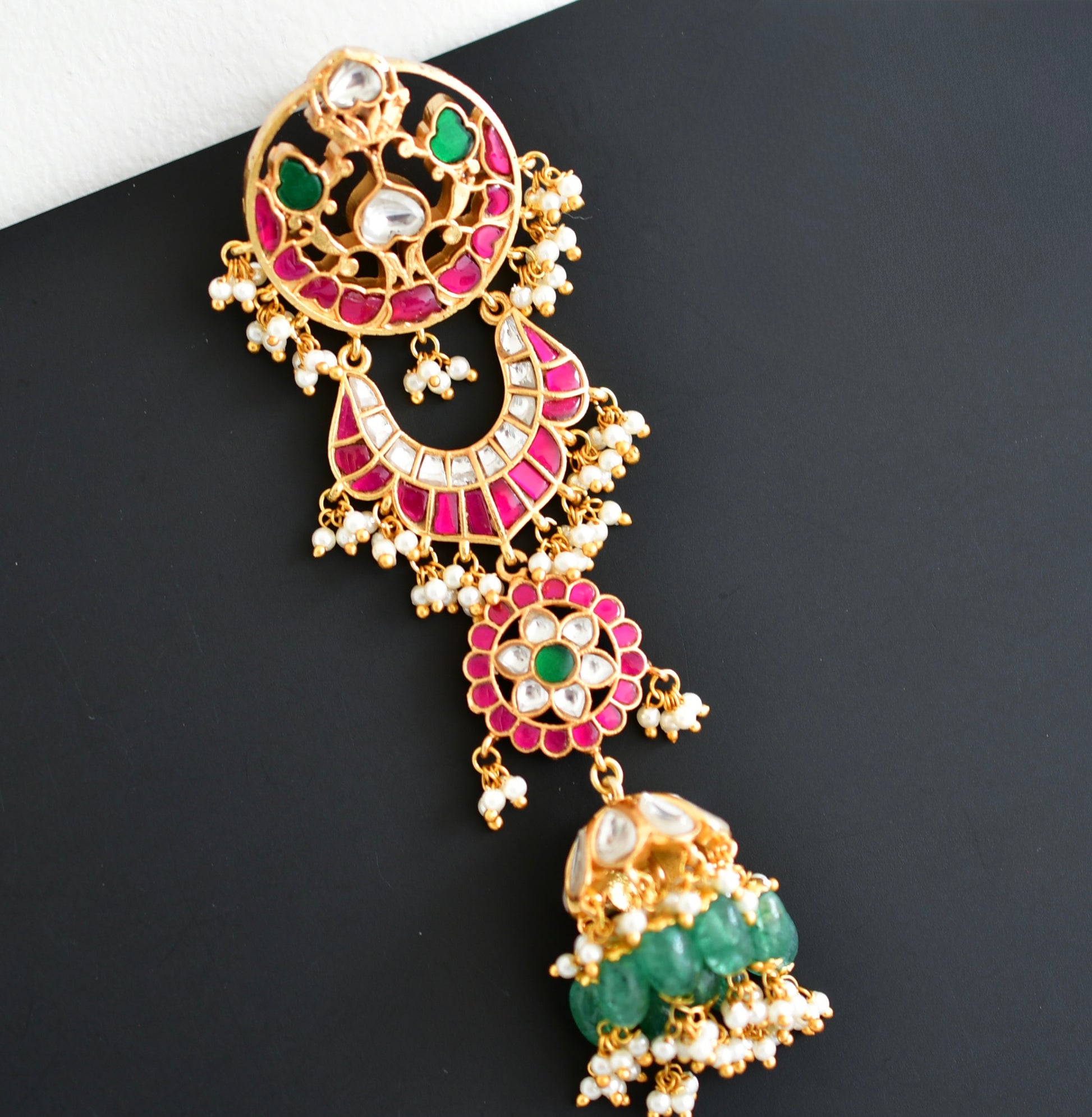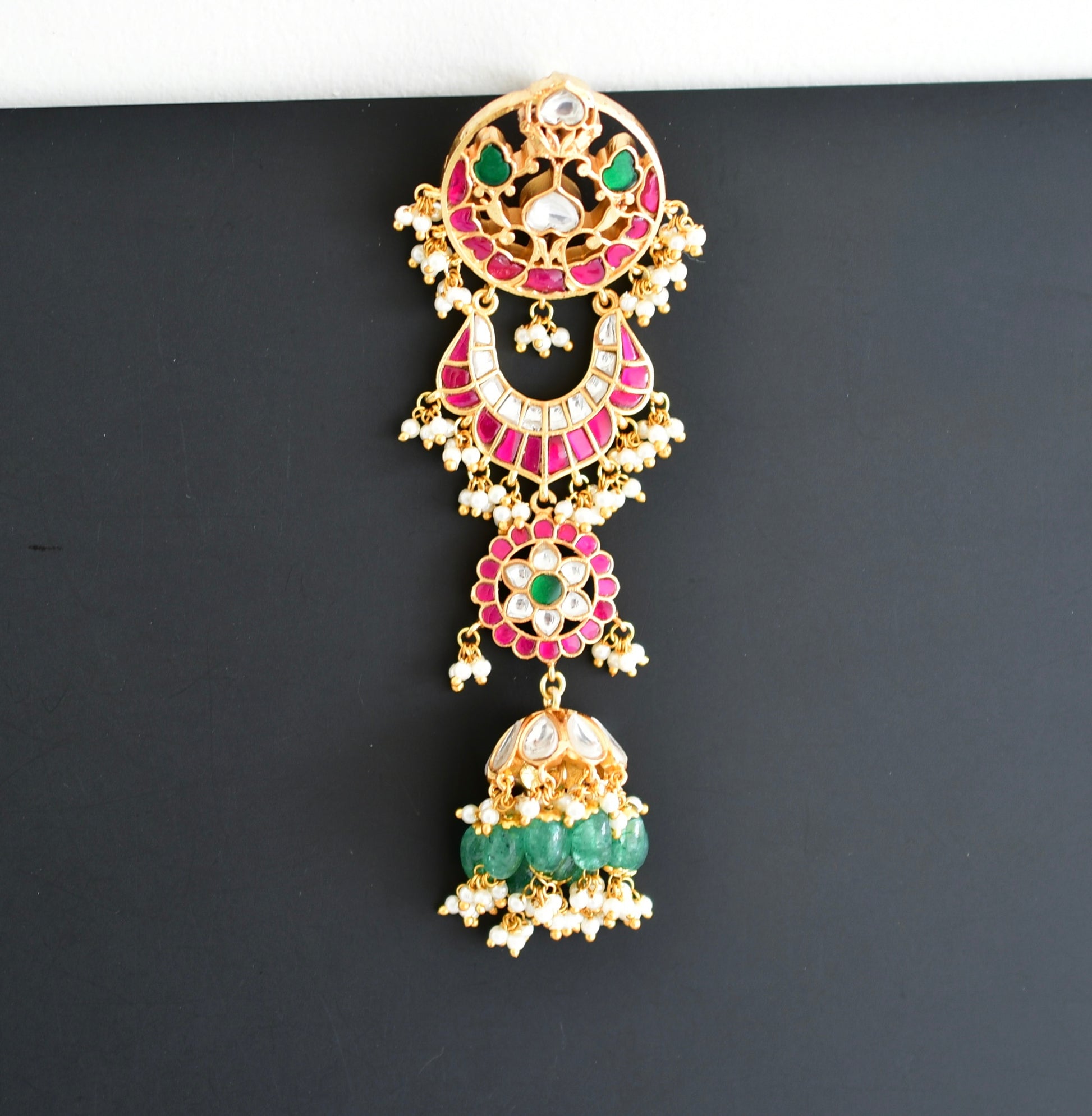 Gold tone pink-green kundan jadau floral hair jewel dj-52382