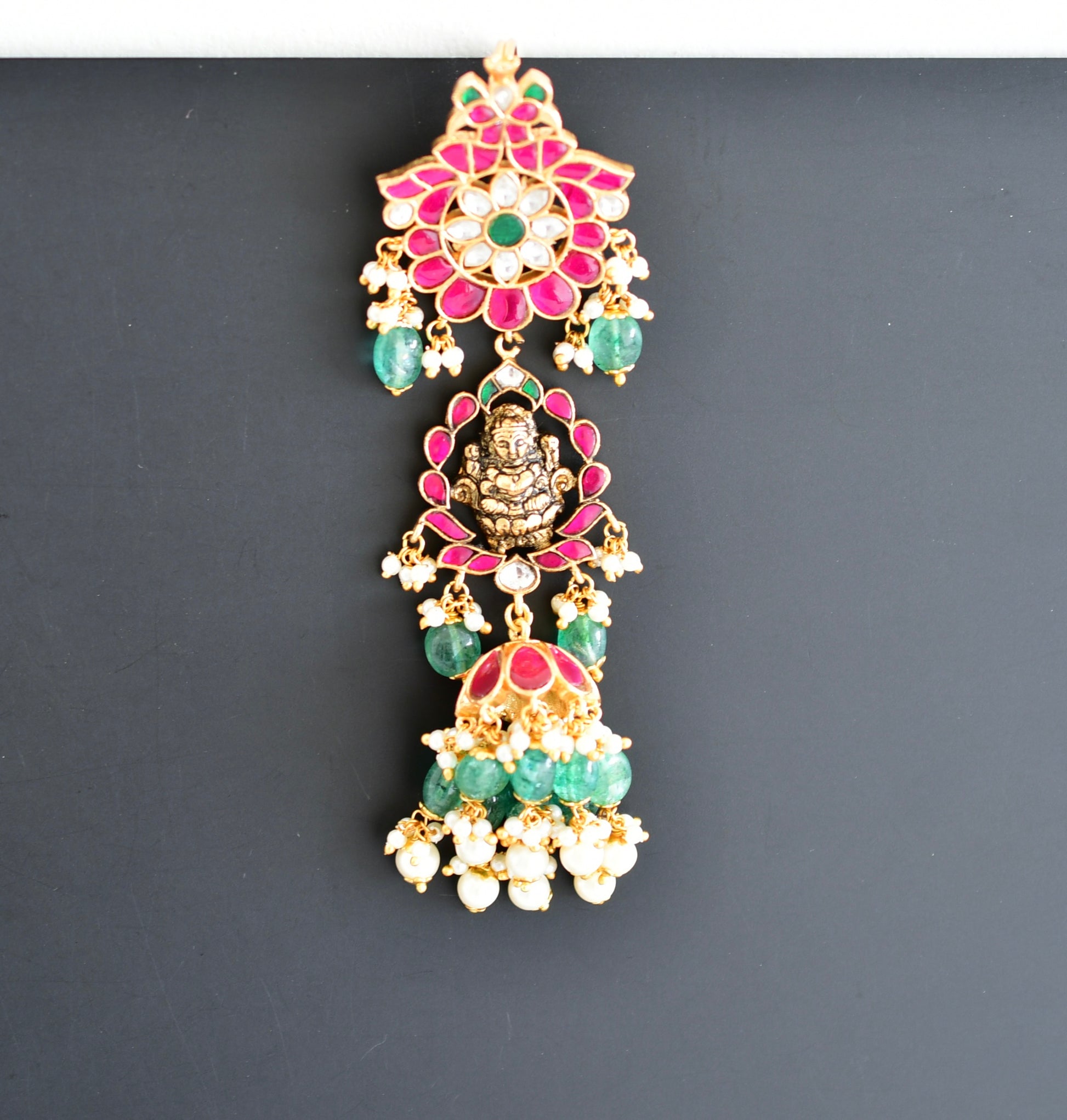 Gold tone pink-green kundan jadau Lakshmi hair jewel dj-52379