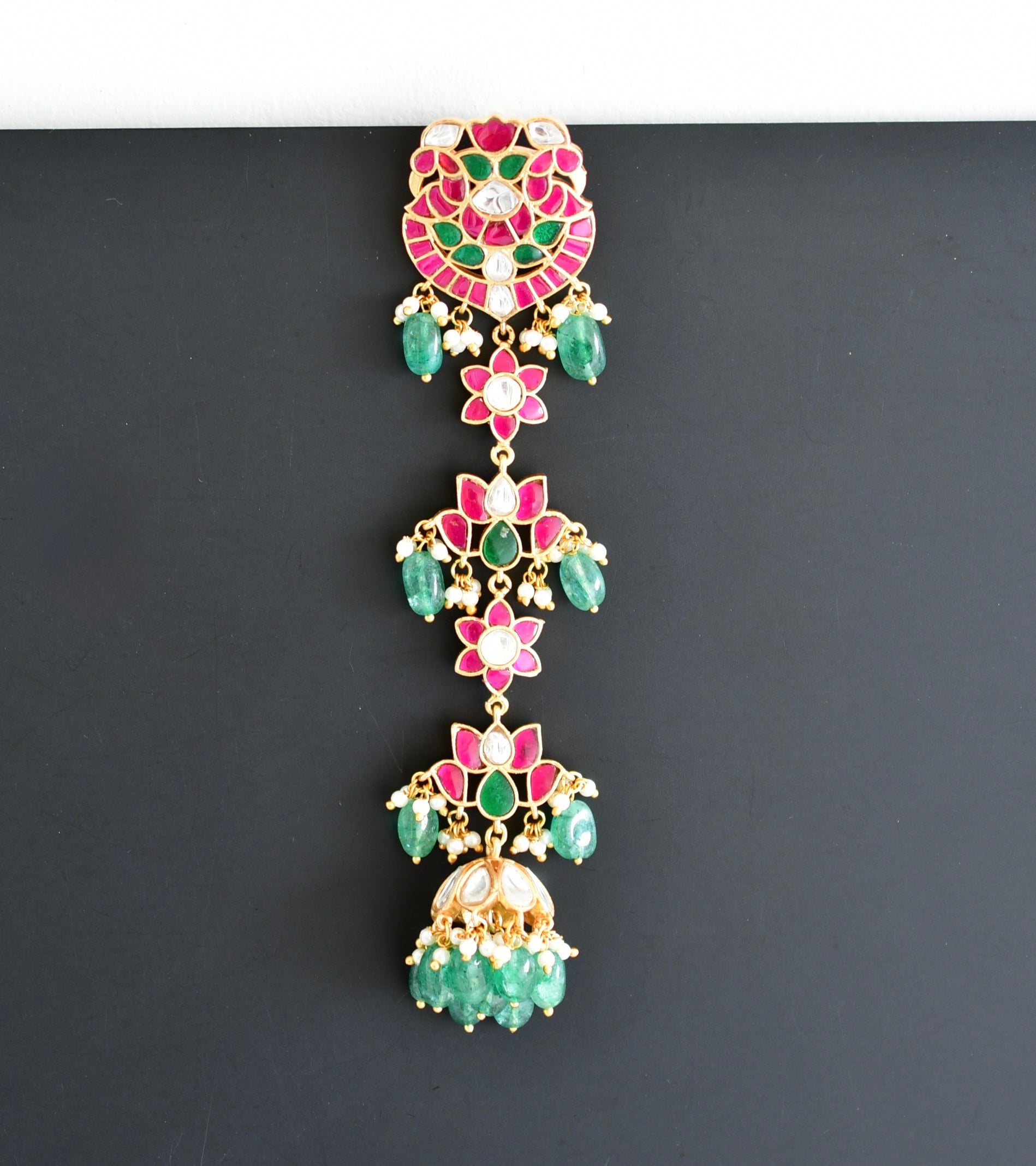 Gold tone pink-green kundan jadau lotus hair jewel dj-52380